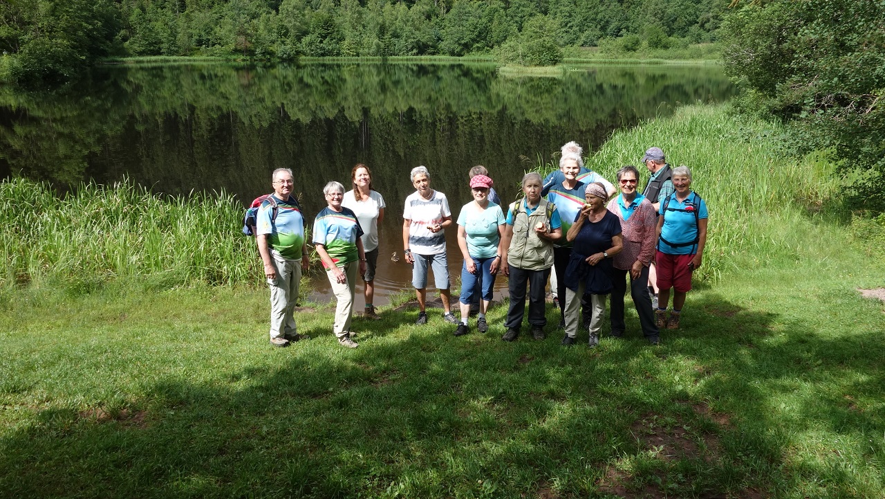 Die Rundwanderung startete am attraktiv gestalteten Eingangsportal am Parkplatz der Sesselbahn und führte auf einem bequemen Fußweg, immer leicht ansteigend, an einem Waldspielplatz und einem Tiergehege vorbei zum romantischen Sankenbachsee. Schon bald nach dem Start einsetzender leichter Nieselregen konnte die gute Stimmung auch nicht trüben. Eine kleine Rast am Seeufer ist ein Muss, um die Idylle des Sees und den Anblick der sich auf der Wasseroberfläche spiegelnden Tannen genießen zu können. Es war gerade die richtige Zeit, denn der Himmel klarte sich auf und die ersten Sonnenstrahlen begrüßten die Wanderer aus Schiltach. Vor allem an sonnigen Wochenendtagen kann man die Stille der Natur auf einem der zahlreichen Ruhebänke rund um den See nicht allein genießen.